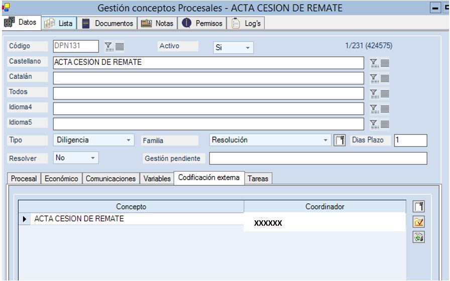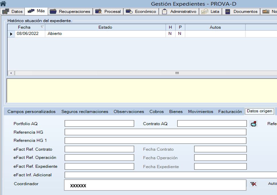 Al añadir el tipo XXXXXX, en la pestaña más de forma automática se indica que el expediente tiene un coordinador (XXXXXX), que obliga a solamente poder introducir las anotaciones procesales y señalamientos asignadas al mismo
