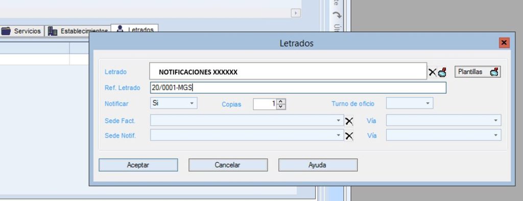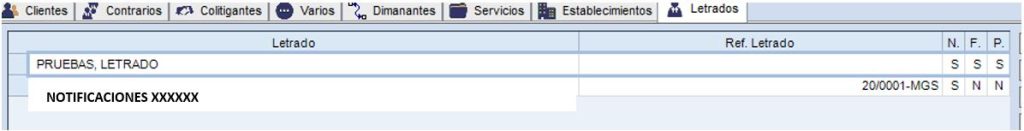 Primero introducimos el letrado del expediente, y como segundo letrado uno que hemos introducido como notificaciones XXXXXX. En éste último añadimos la referencia de XXXXXX.