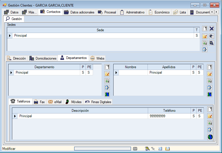 Departamentos: Gestiona los distintos departamentos de la Sede seleccionada y sus datos adicionales. Contactos, teléfonos, emails, etc..