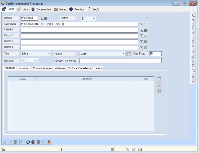 Entraremos el Código manualmente y posteriormente entraremos el Concepto Procesal (posibilidad de entrarlos en 5 idiomas diferentes)