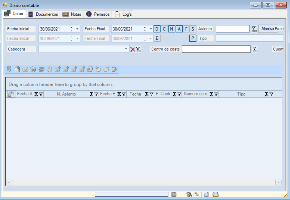 Con el botón «Mostrar», generaremos la visualización del diario contable en función de los parametros anteriormente indicados