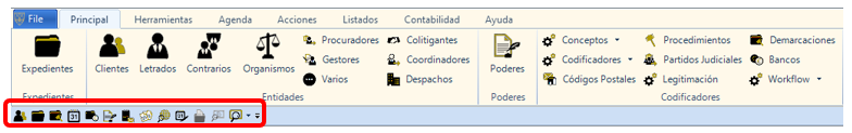 - En la pestaña PRINCIPAL tenemos acceso a las partes de: EXPEDIENTES, CLIENTES, LETRADOS, CONTRARIOS, ORGANISMOS, (Procuradores, Gestores, Varios, Colitigantes, Coordinadores, Despachos), PODERES, CONCEPTOS, CODIFICADORES, CÓDIGOS POSTALES, PROCEDIMIENTOS, PARTIDOS JUDICIALES, LEGITIMACIÓN CODIFICADORES, DEMARCACIONES, BANCOS, WORKFLOW