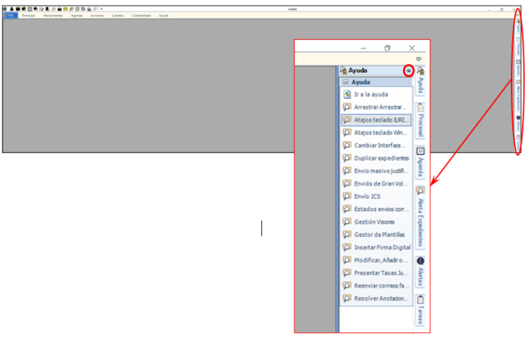 En la parte derecha, verticalmente, veremos las pestañas de las tareas más habituales (Ayuda, Procesal, Agenda, Alerta Expedientes, Alertas, Tareas).