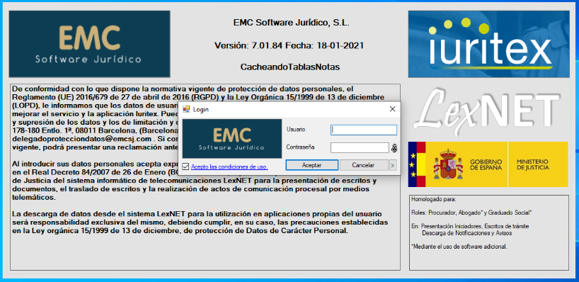 A continuación, en la ventana de «Login» pulsaremos el botón «Aceptar» y visualizaremos la ventana principal de Iuritex: