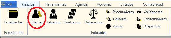 Para consultar, dar de alta, modificar o borrar datos de los intervinientes clasificados como «Clientes», lo haremos desde la barra menú Principal, hacer clic en el icono «Clientes» para acceder a la Gestión Clientes.