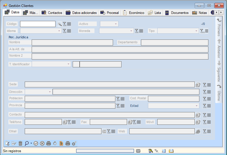 Accederemos a la pantalla principal de gestión de Datos en Gestión Clientes que nos aparecerá con los campos en blanco por defecto:
