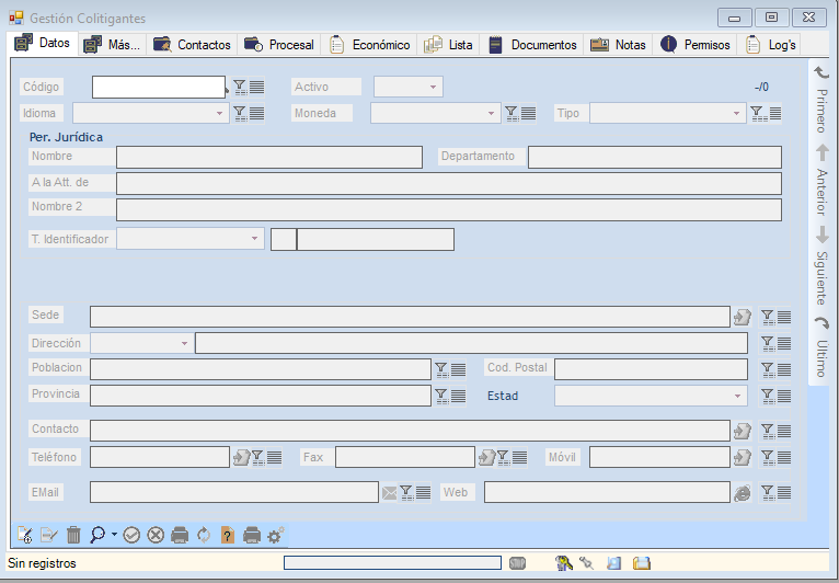 Accederemos a la pantalla principal de gestión de Datos en «Gestión Colitigantes» que nos aparecerá en blanco por defecto: