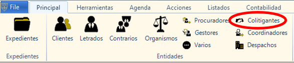 Desde la barra menú Principal, hacer clic en el icono «Colitigantes» para acceder a la «Gestión Colitigantes»