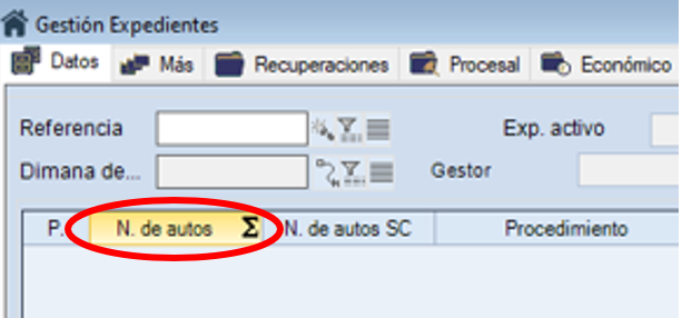 Para buscar un expediente concreto en Iuritex, haremos clic en el botón ∑ e introduciremos el número de autos o referencia del expediente que buscamos