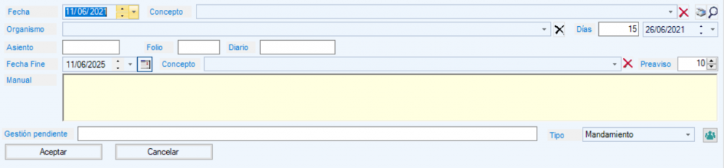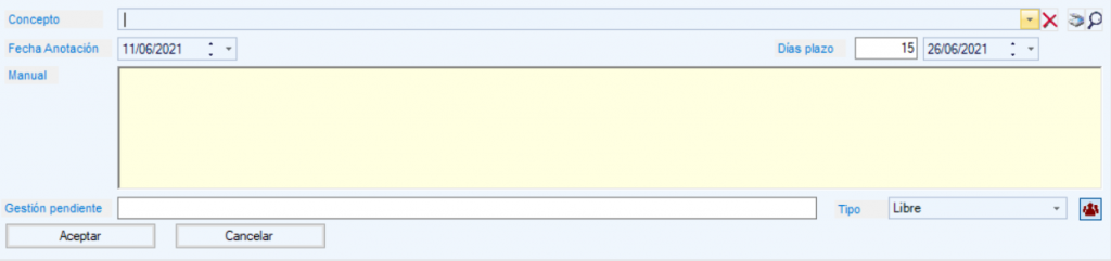 En el campo Gestión Pendiente podremos anotar texto explicativo sobre la Gestión Pendiente relacionada