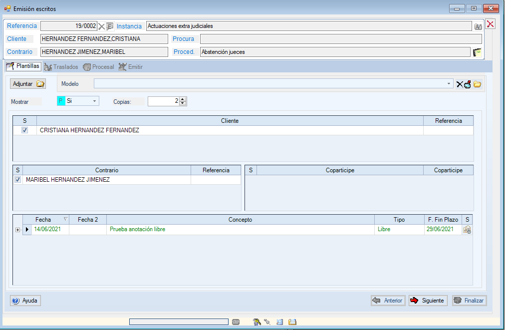 - Generar y emitir escritos desde una misma anotación en el seguimiento utilizando plantillas predefinidas o creadas por el usuario