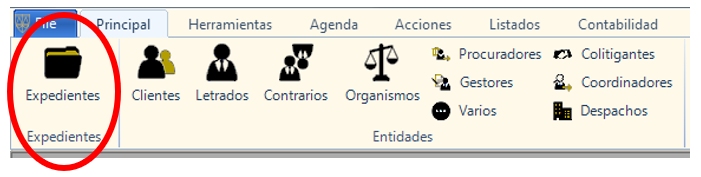 Desde la barra menú Principal, hacer clic en el icono «Expedientes» para acceder a la Gestión Expedientes