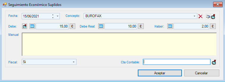 En el campo Concepto, seleccionaremos desde la lista desplegable la opción que necesitemos o si por lo contrario lo que queremos es añadir un nuevo tipo de Concepto nosotros, deberemos pulsar MAYÚSCULAS +