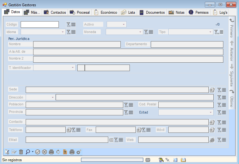 Accederemos a la pantalla principal de gestión de Datos en «Gestión Gestores» que nos aparecerá en blanco por defecto: