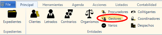 Para modificar, eliminar y dar de alta datos de los intervinientes clasificados como «Gestores», lo haremos desde la barra menú Principal, hacer clic en el icono «Gestores» para acceder a la «Gestión Gestores»