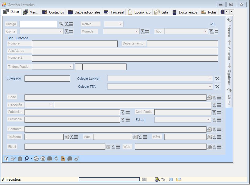 Activo: Indica si el Letrado está activo o no. De esta forma, sin necesidad de borrarlo, podremos filtrar y controlar los Letrados que se muestran en las consultas.
