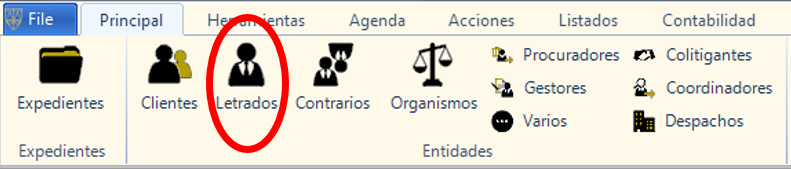La gestión de los datos propios de los «Letrados» la haremos desde la barra del menú Principal. Pulse sobre el icono «Letrados» para acceder a la Gestión de Letrados.