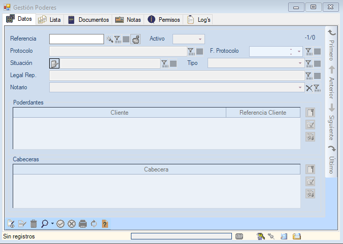 Accederemos a la pantalla principal de gestión de Datos en Gestión Poderes que nos aparecerá con los campos en blanco por defecto: