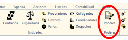 Para dar de alta Poderes notariales vinculados a un cliente, lo haremos desde la barra menú «Principal», haremos clic en el icono «Poderes»
