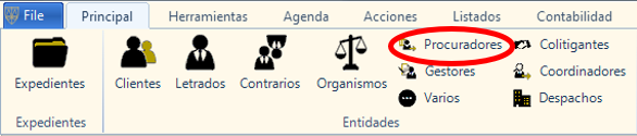 Para modificar, eliminar y dar de alta datos de los intervinientes clasificados como «Procuradores», lo haremos desde la barra menú Principal, hacer clic en el icono «Procuradores» para acceder a la «Gestión Procuradores»