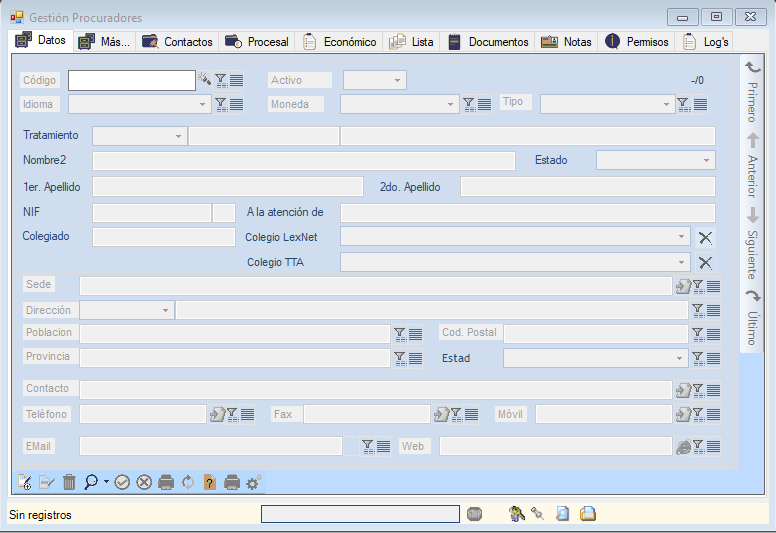Accederemos a la pantalla principal de gestión de Datos en «Gestión Procuradores» que nos aparecerá en blanco por defecto: