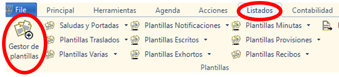 Para acceder al Gestor de plantillas de Iuritex Desde el menú principal accederemos a la pestaña Listados y haremos clic en el icono Gestor de planillas