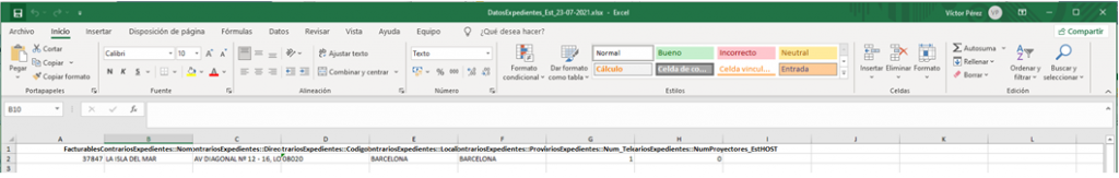 Por parte de «Thespis» llegan dos ficheros Excel. Un Excel con información del expediente, y otra información con los establecimientos.