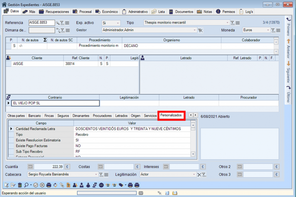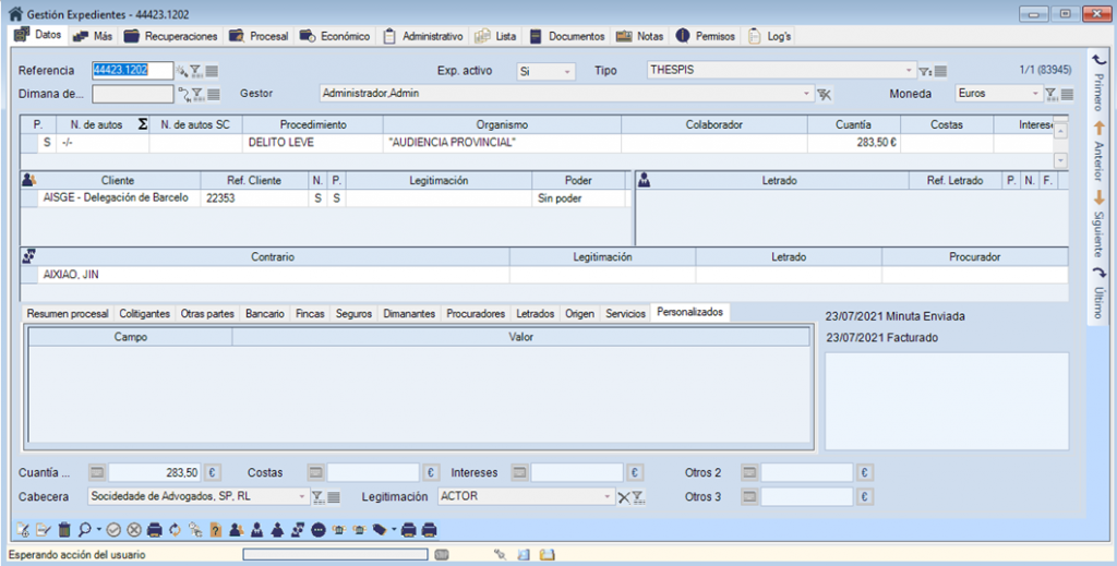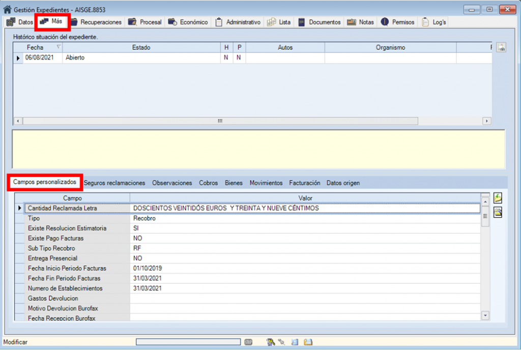 En la parte de personalizados, podemos encontrar campos con información adicional. Esto se ha hecho porque «Aisge» modifica los expedientes que salen directamente de «Thespis», y les añadía información a mano.