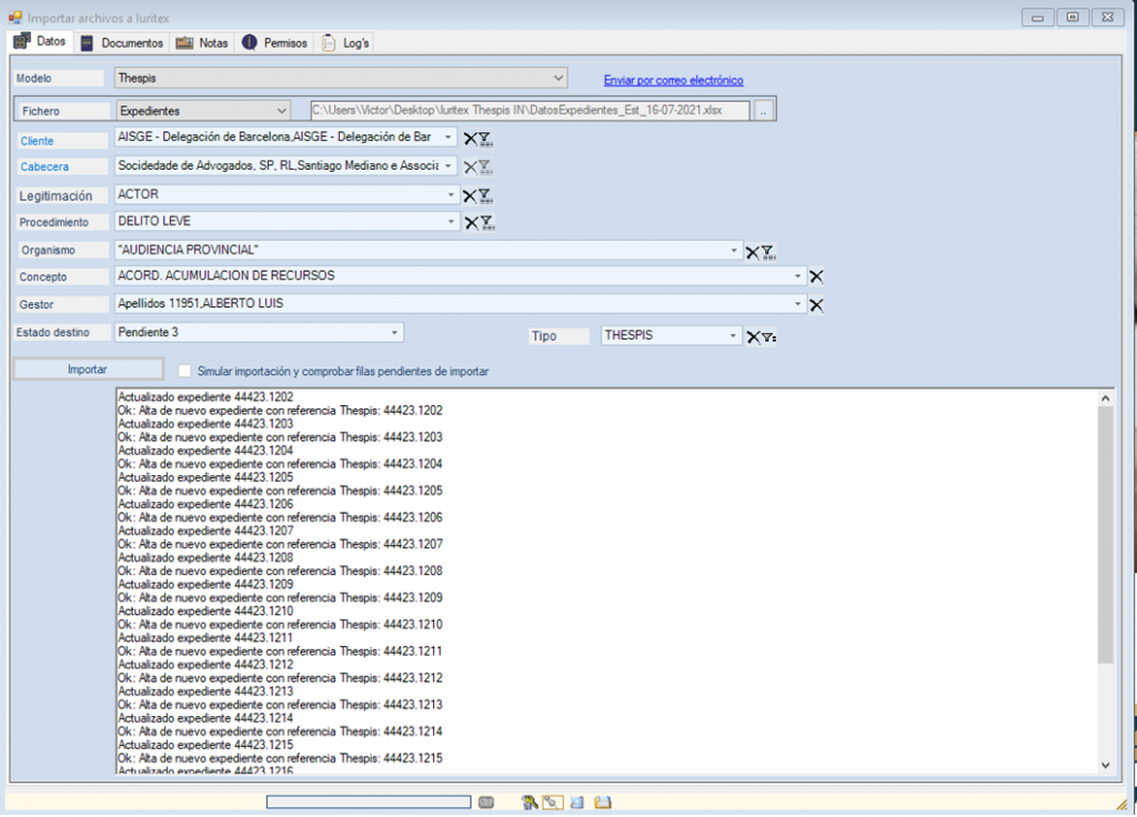 Haremos clic en el botón «Importar» y se crearán automáticamente todos los expedientes. Se crean con la referencia del cliente, en este caso de pruebas es «44423.xxxx.»
