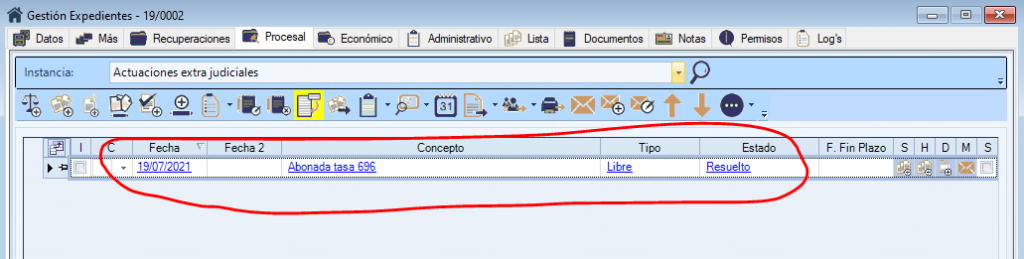 Desde la pantalla del seguimiento Procesal, podremos gestionar el historial de los expedientes, controlando las tareas realizadas y pendientes, los señalamientos y avisos, con la particularidad de poder destacar las líneas de las anotaciones en distintos colores en función de la importancia o tipo de anotación realizada.