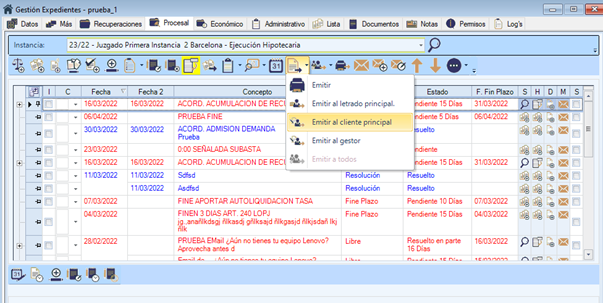 Para acceder al envió de burofax hay que emitir a un ente, en este caso accedemos a un expediente, seleccionamos una anotación procesal y seleccionamos emitir al cliente por ejemplo.