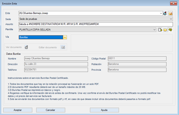 Una vez en el formulario seleccionamos el tipo de vía Burofax, automáticamente el programa rellena los datos del destinatario que tiene en su ficha de Iuritex, si falta alguno de esos datos no podrás enviar el Burofax.