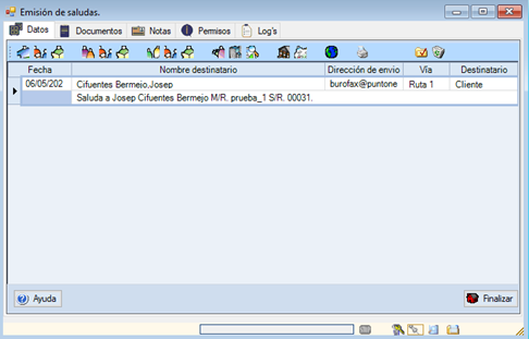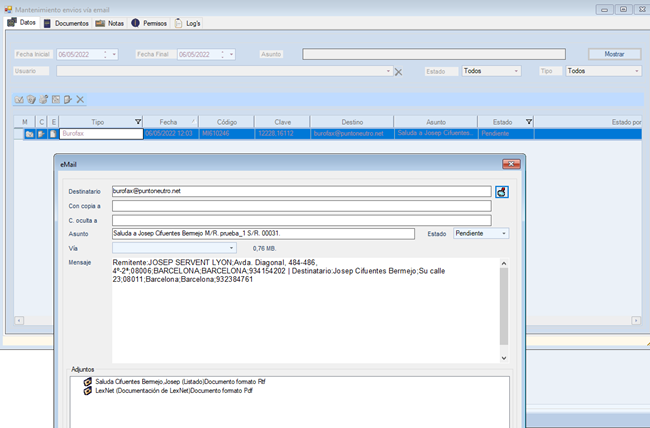 Una vez enviado en gestión de correo podemos ver la emisión, esta emisión la recibirá el sistema AtexMail server y se encargara de llamar a la función de punto neutro y enviar el burofax, los datos del remitente y destinatario se envían en el campo de texto separado por ‘;’