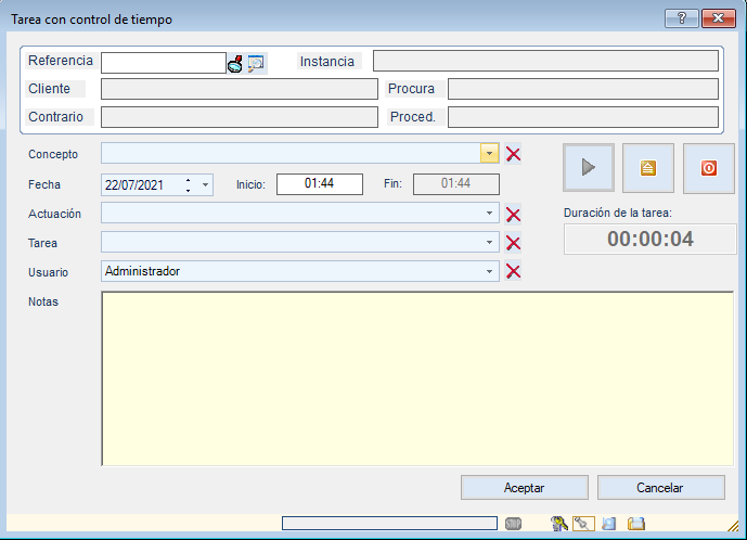 En el ventana «Tarea con control de tiempo» en el campo «Referencia» visualizaremos el código de la referencia del expediente buscado.