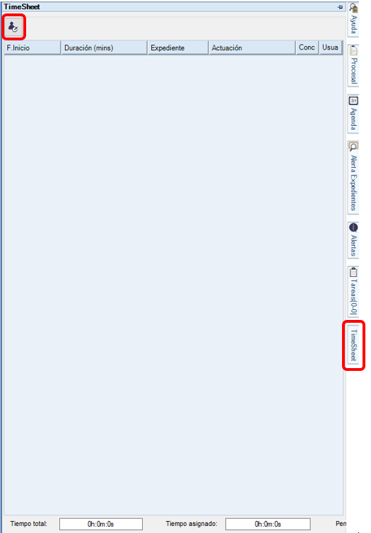 Para acceder a la pantalla de control de tiempos por expedientes, accederemos a la opción «TimeSheet» ubicada en la parte derecha de la pantalla