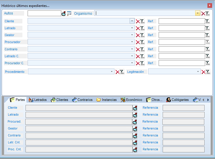 En el campo «Contrario» indicaremos el nombre y apellidos del contrario al que pertenece el expediente que buscamos. Lo podremos seleccionar desde el listado desplegable. También podemos buscar por la referencia del «Contrario»